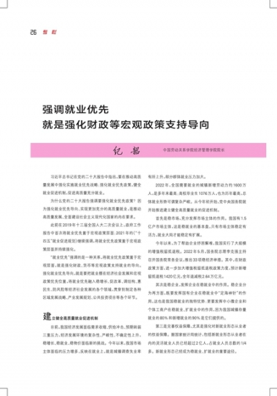 强调就业优先 就是强化财政等宏观政策支持导向