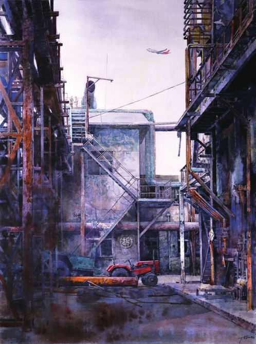 海的胸襟,山的气度,加之多年的工会工作阅历让他对工业发展情境的熟稔,随着岁月的洗练,逐渐内化为丁毅血脉中独具魅力的“山海厂情”,从而使得他近年的创作迎来了喷涌式的个性绽放——2019年,水彩画《工业记忆》成功入选中国第13届全国美术作品展。2020年,作品《工业记忆之二》入选全国水彩网络展获优秀奖,《工业记忆之三》入选全国大城市画院作品展,还被评为泰安市第14批专业技术拔尖人才。2021年,作品《东平银河浮桥》入选山东省黄河文化主题展,《工业记忆之二》入选中国水彩名家学术邀请展。