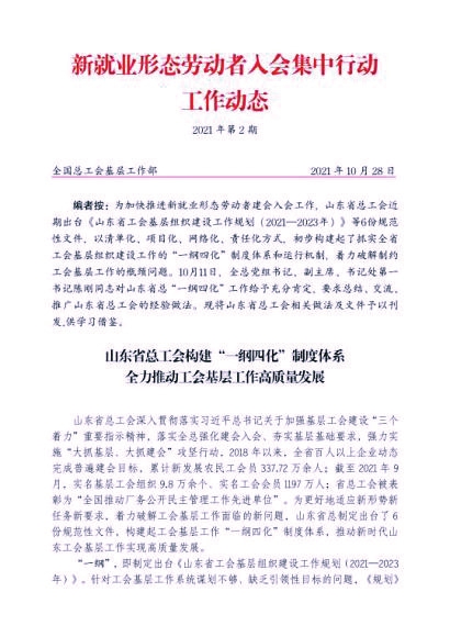 扩大组织覆盖,夯实基层基础。省总工会强力实施“基层工会建设攻坚突破年”行动、“大抓基层大抓建会”攻坚行动,指导推进市、县级产业(行业)工会建设,持续加强“小三级”工会建设,推行工会网格化管理服务模式,指导全省1800余个乡镇(街道)全部建立工会组织,2021年以来累计投入140万元,打造43个省级村(社区)工会工作项目。省总工会指导各市建立企业建会入会工作台账、任务清单、重难点建会企业目录,强化企业建会动态管理。目前,全省有实名基层工会组织11.8万个、会员1371万余人。组织开展农民工入会集中行动、物流货运企业建会及物流货运司机等群体入会集中行动、新就业形态建会入会集中行动等,不断扩大工会组织覆盖。2021年以来全省新增新就业形态劳动者会员60.6万人;2019年以来全省新增农民工会员375.5万余人。创新建设山东省网上工会组织系统,为全覆盖、全时空做好建会入会等工作提供了信息化工具。系统上线以来,全省线上入会100万余人、转会30万余人次。