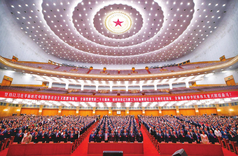 人民大会堂大礼堂气氛热烈。主席台上方悬挂着“中国工会第十八次全国代表大会”的会标,后幕正中象征着中国工会和中国工人阶级团结统一的工会会徽熠熠生辉,10面红旗分列两侧。二楼眺台悬挂着“坚持以习近平新时代中国特色社会主义思想为指导,全面贯彻党的二十大精神,组织动员亿万职工为全面建设社会主义现代化国家、全面推进中华民族伟大复兴团结奋斗!”的巨型横幅。
