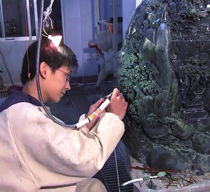 “我现在做的这种山水的摆件,会充分利用原材料的外形、颜色进行雕刻设计,保留原材料原貌的同时,把雕刻的部分进行精细地刻画,利用圆雕、浮雕、镂空这些手法,把风景和场景表现出来。”祝贺说。