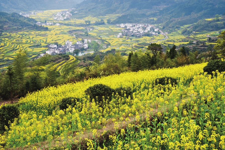 远山层叠,围成一个狭长开阔的盆地,星罗棋布的油菜花田与几个村庄尽收眼底,清一色徽派小楼,镶嵌在明晃晃的花海,让这里的春天越发雅致而明亮。