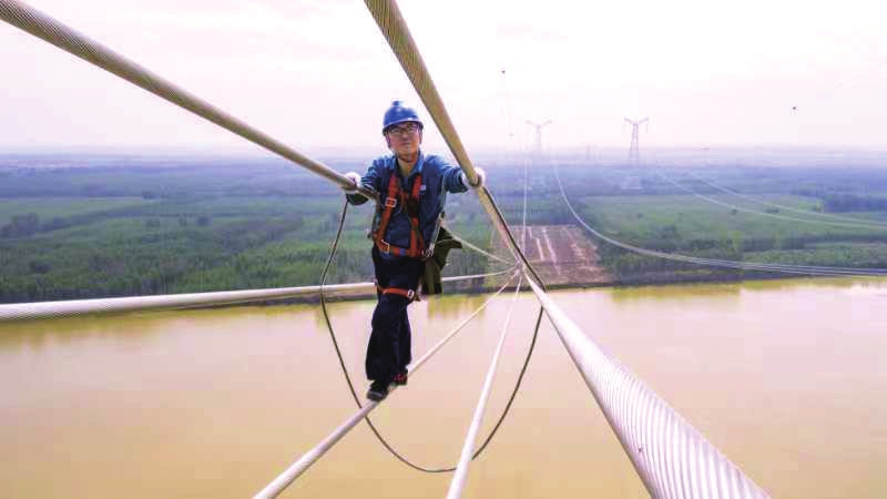 次日,北风呼啸,四野苍茫。小心翼翼挪动着脚步,艰难地攀爬上36米高的铁塔。脚下踩着直径只有1厘米的脚钉、5厘米宽的角铁,心中不免漂浮几丝紧张甚至恐惧。到了塔顶,再慢慢挨过绝缘子串,虚汗不禁浸透了后背,冷风一吹,激灵灵地打冷战……