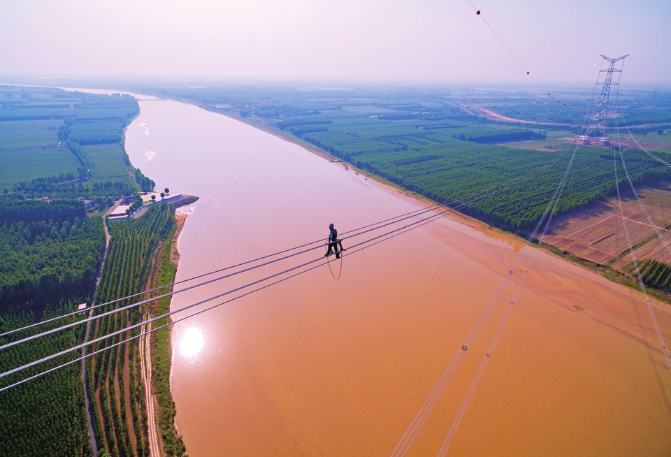2016年7月,山东省首座特高压变电站——泉城1000千伏特高压变电站正式运行。特高压入鲁,王进的工作状态又发生了改变——一是作业高度增加了。1000 千伏杆塔平均高 107 米,黄河高跨杆塔高度是215米。二是工作难度增大了。带电作业所使用的绳子均为无极绳,36米高的杆塔需要长72米、重8.6公斤的绝缘绳,107米高的特高压需要使用长214米、重25.6公斤的绝缘绳,215米高的黄河大跨越则需要长430米、重51.6公斤的绝缘绳。