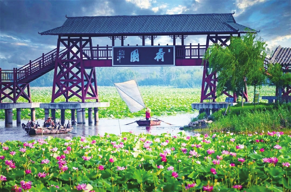 清晨的荷园似与世隔绝的仙岛,晨光透过薄雾洒下五彩,落在松林与水杉之上。一条条小径串联着岛上的一座座建筑,山门牌坊、象贤轩、湖人书屋、观澜亭、赏荷亭、大铜牛……渔船码头位于松林和湖岛之间,把小岛无限放大,连着千亩之湖,连着无边的荷田。南边那条通向远方的大运河,宽阔的湖面上千吨级货轮和运输队穿梭不息,汽笛声不时打破小岛的宁静,消失在天空下。一声声鸟鸣穿行在树梢间,雨露沾满昨晚的诗意,滴在脚下,我放慢脚步,慢一点,再慢一点,就是怕惊扰一地的美。